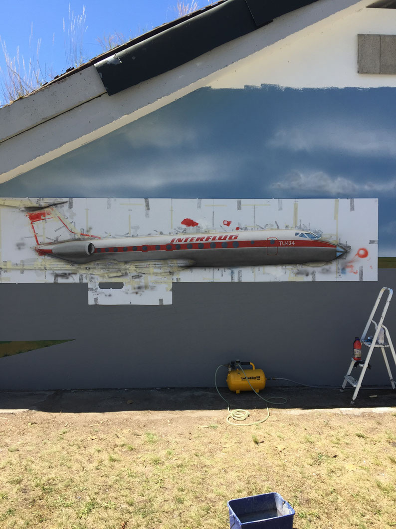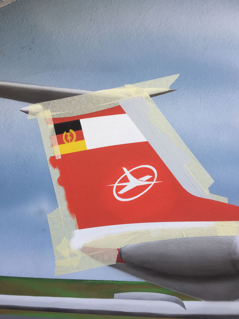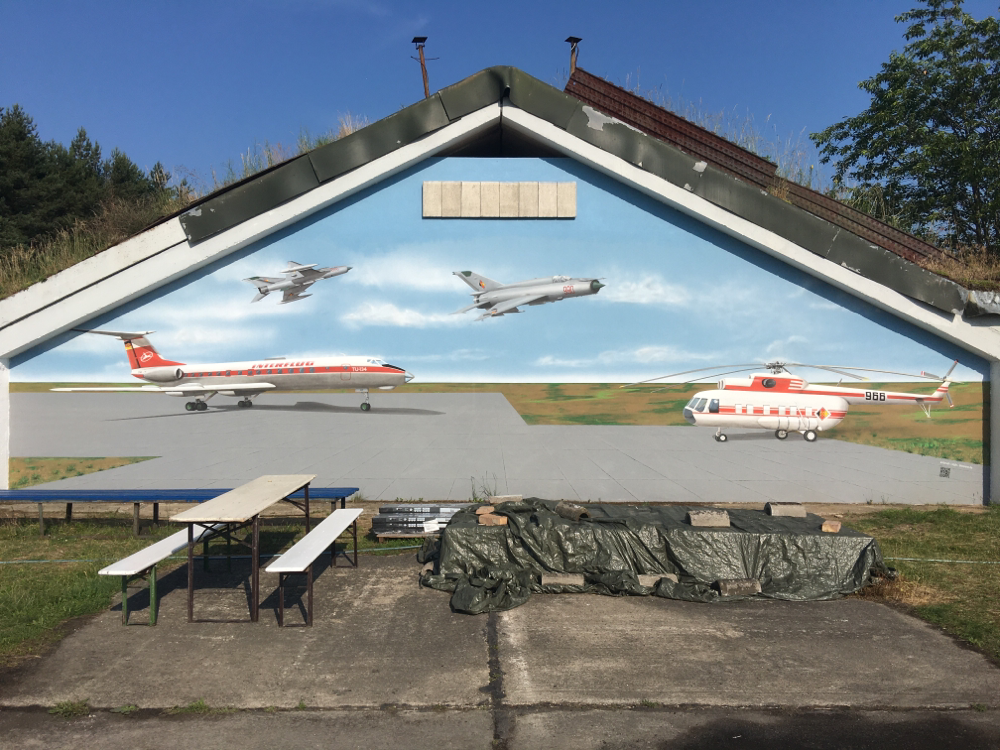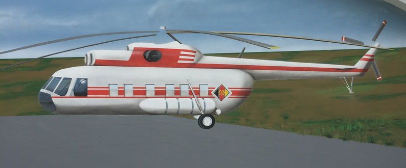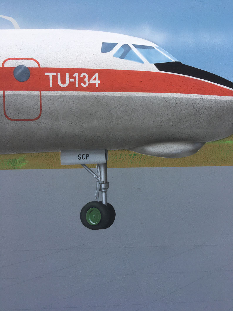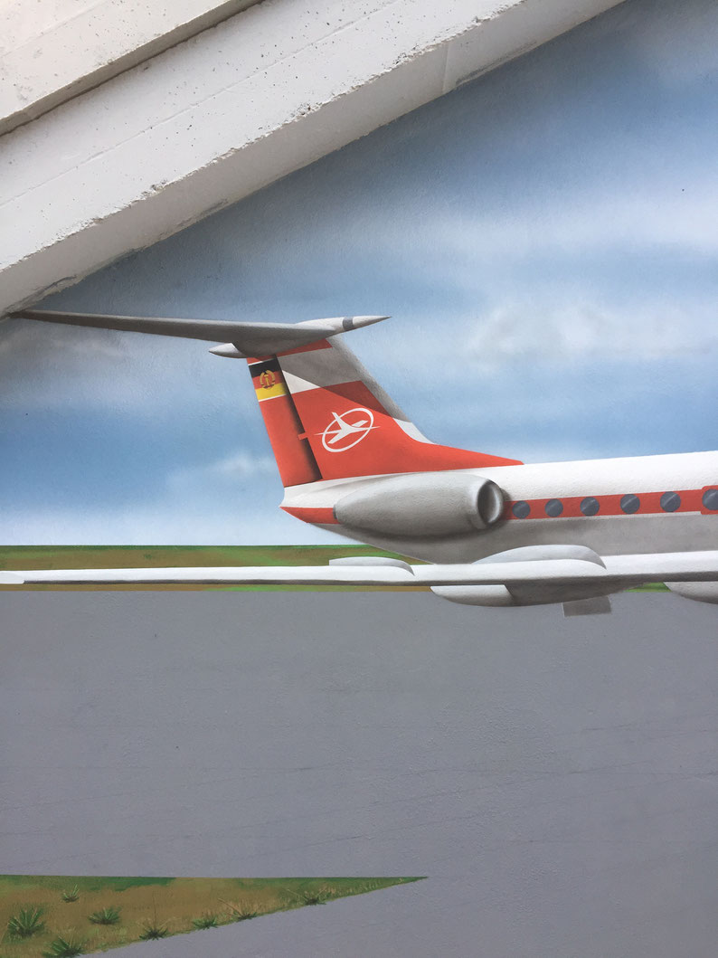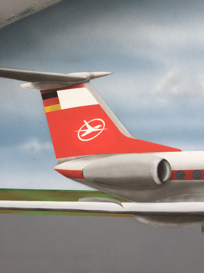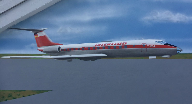 Auf dem Wandbild sind links eine TU 134 und rechts eine MI 8S mit der Lackierung des Transportfliegergeschwaders 44 (Regierungsflieger) zu sehen und im oberen Teil 2 MiG 21.