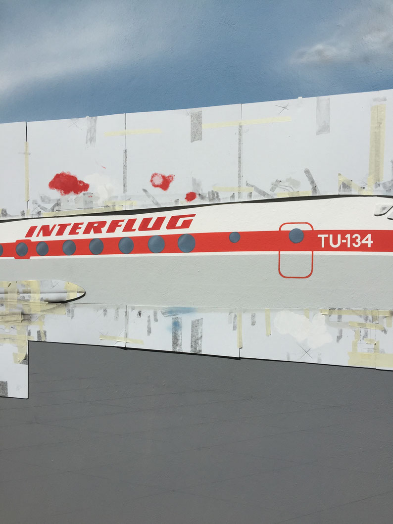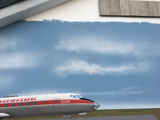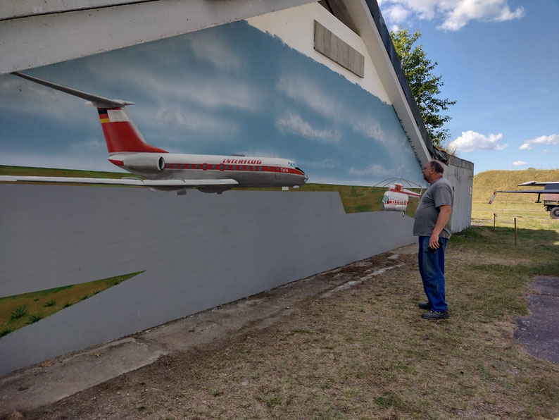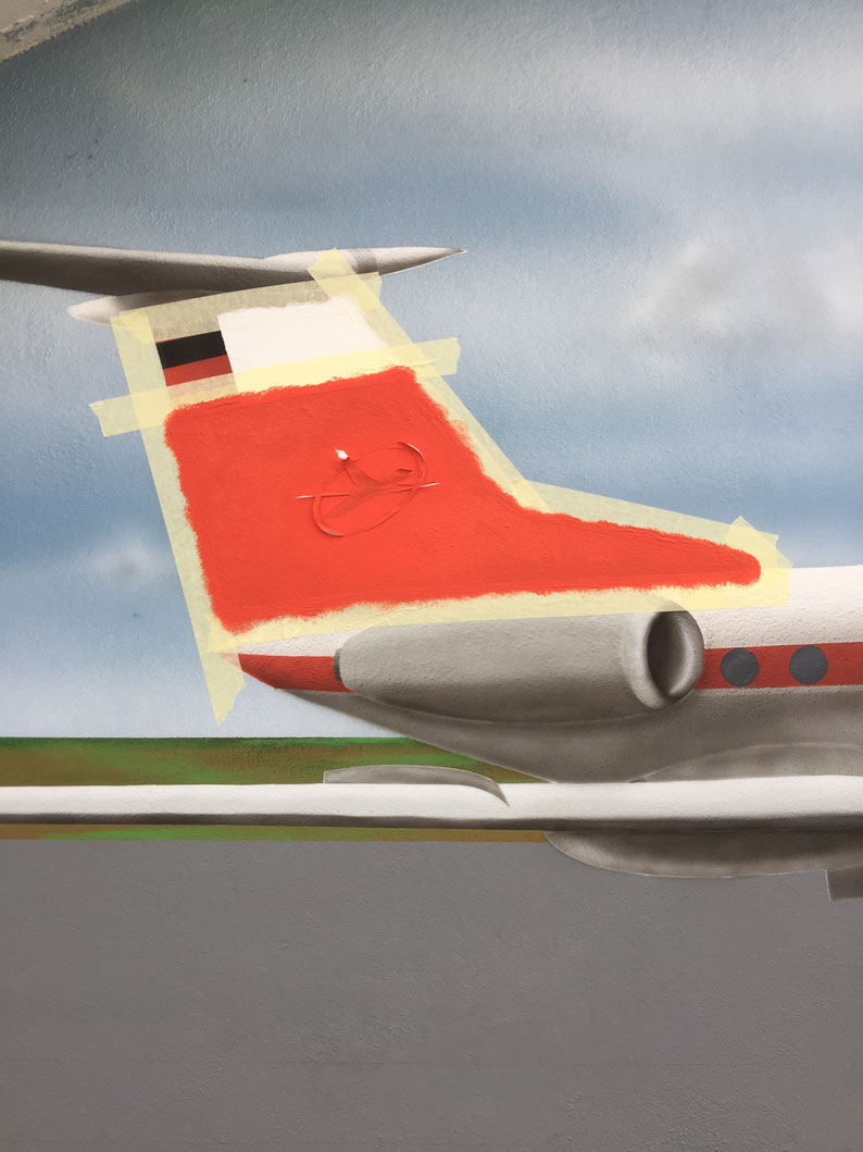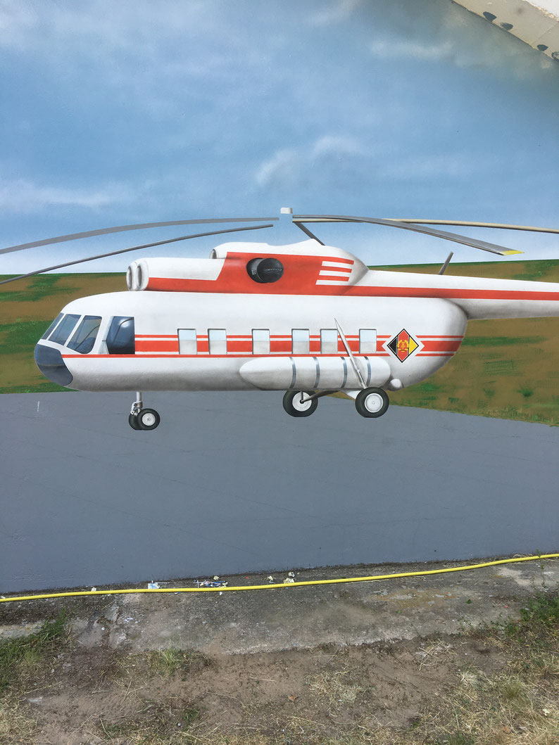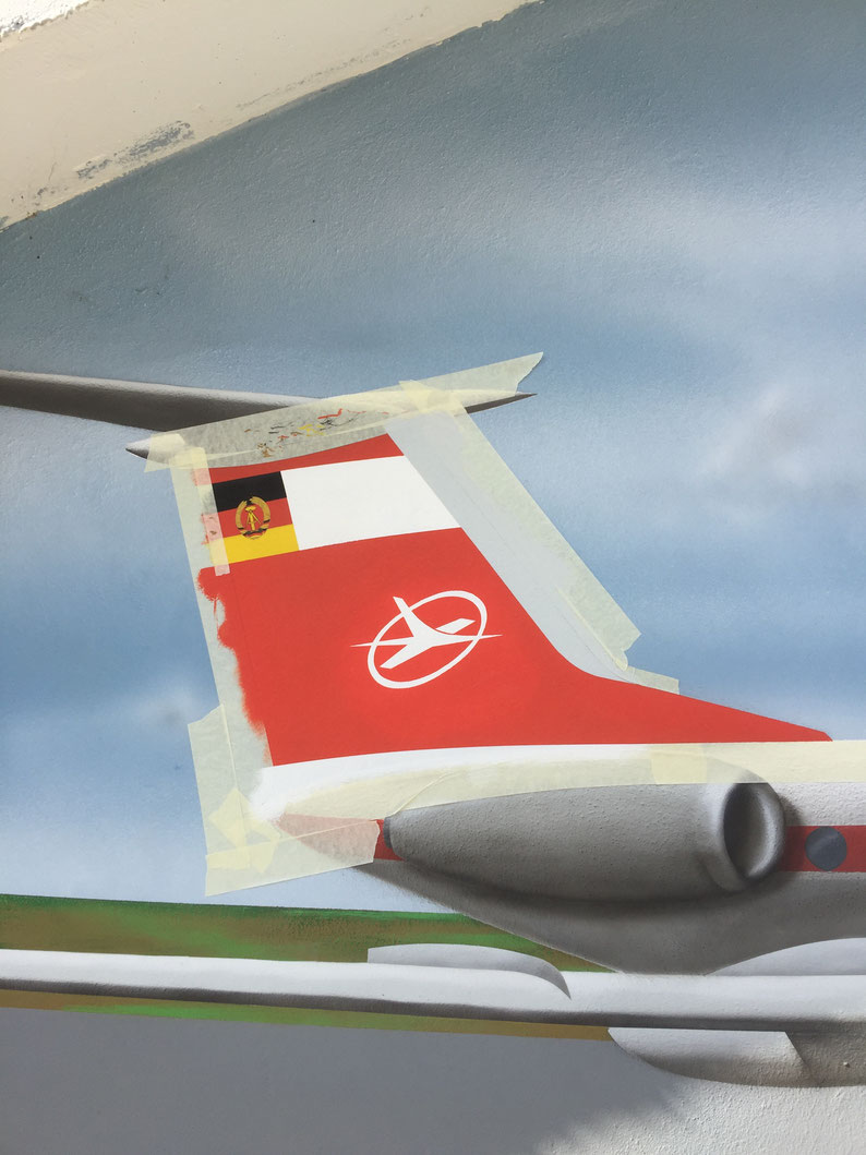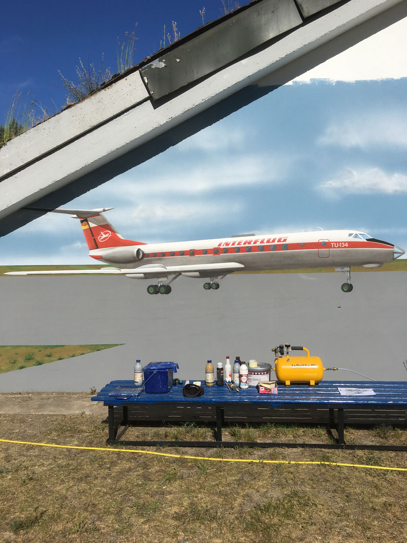 Auf dem Wandbild sind links eine TU 134 und rechts eine MI 8S mit der Lackierung des Transportfliegergeschwaders 44 (Regierungsflieger) zu sehen und im oberen Teil 2 MiG 21.