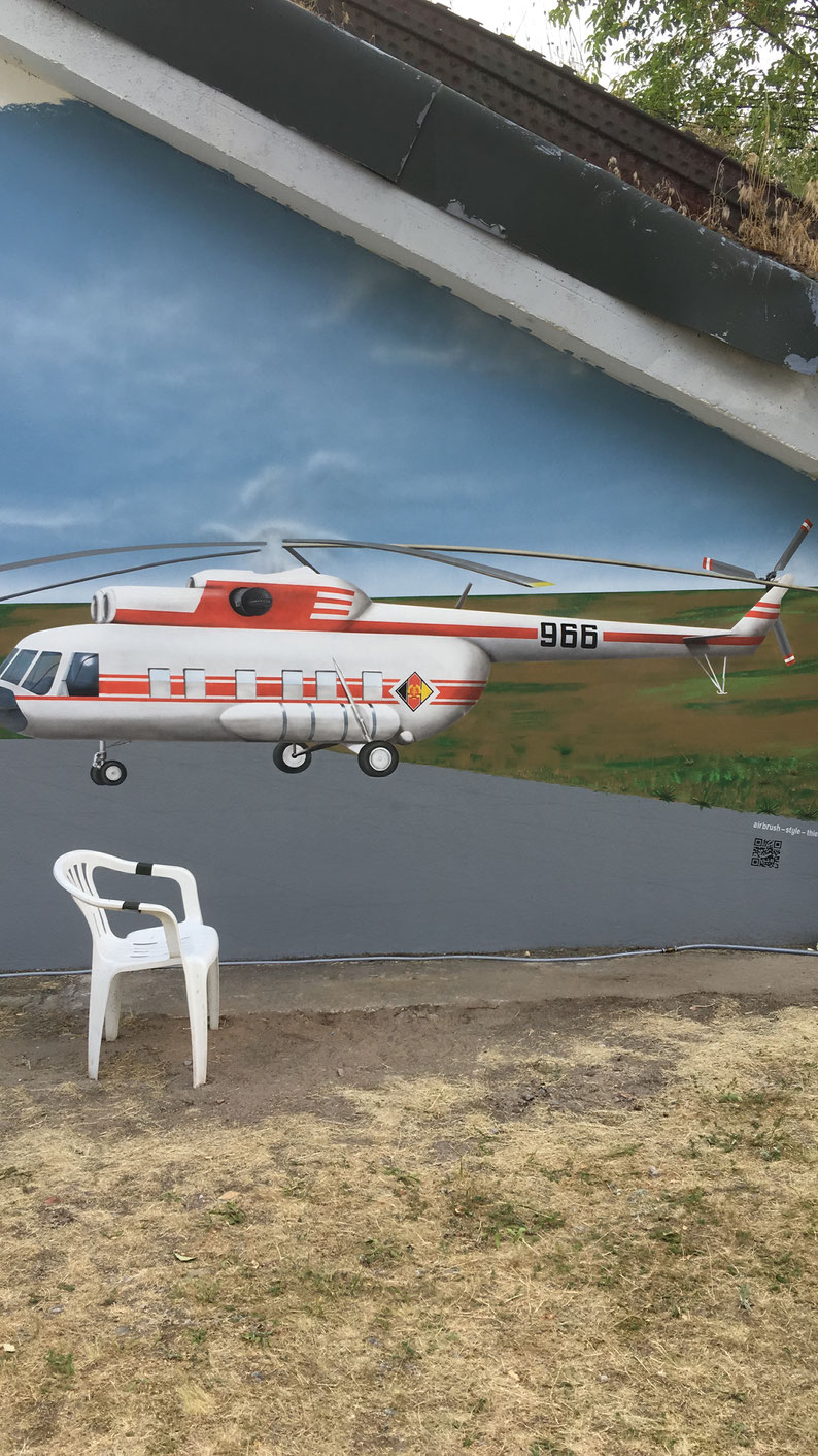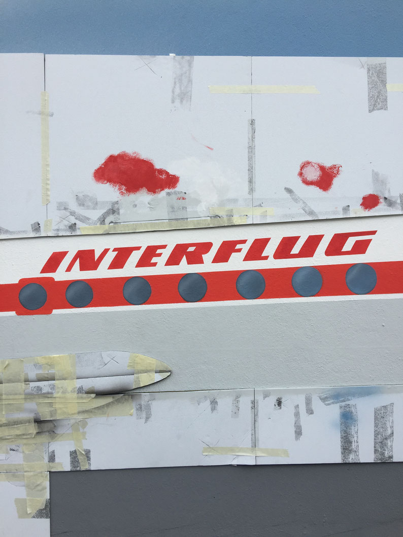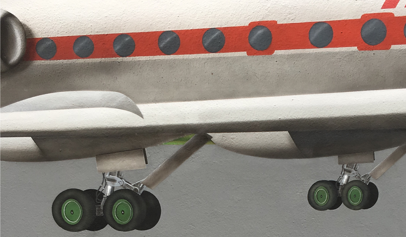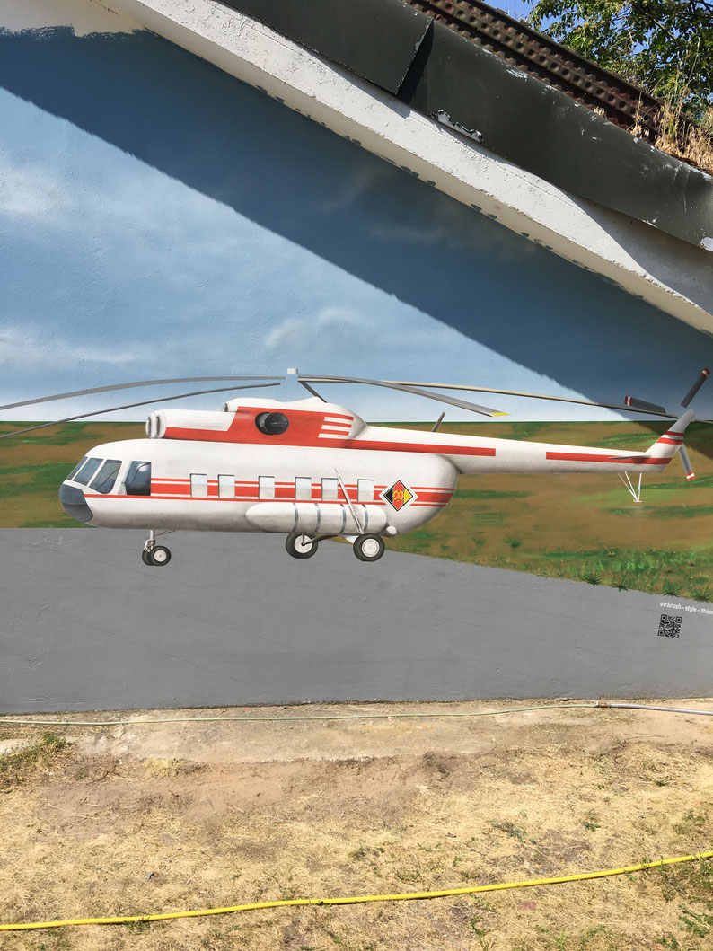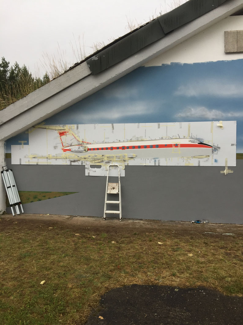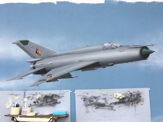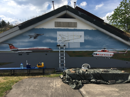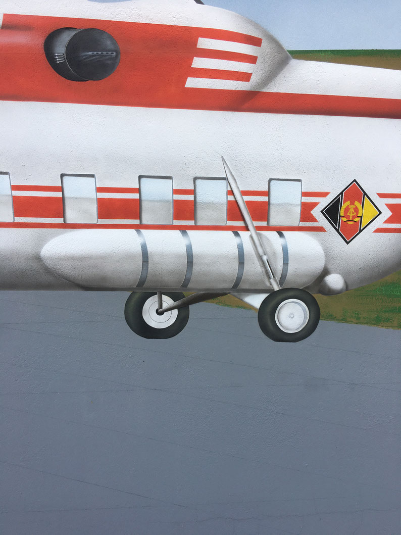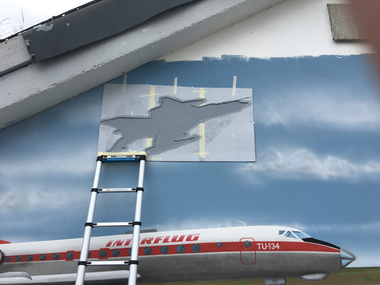 Auf dem Wandbild sind links eine TU 134 und rechts eine MI 8S mit der Lackierung des Transportfliegergeschwaders 44 (Regierungsflieger) zu sehen und im oberen Teil 2 MiG 21.