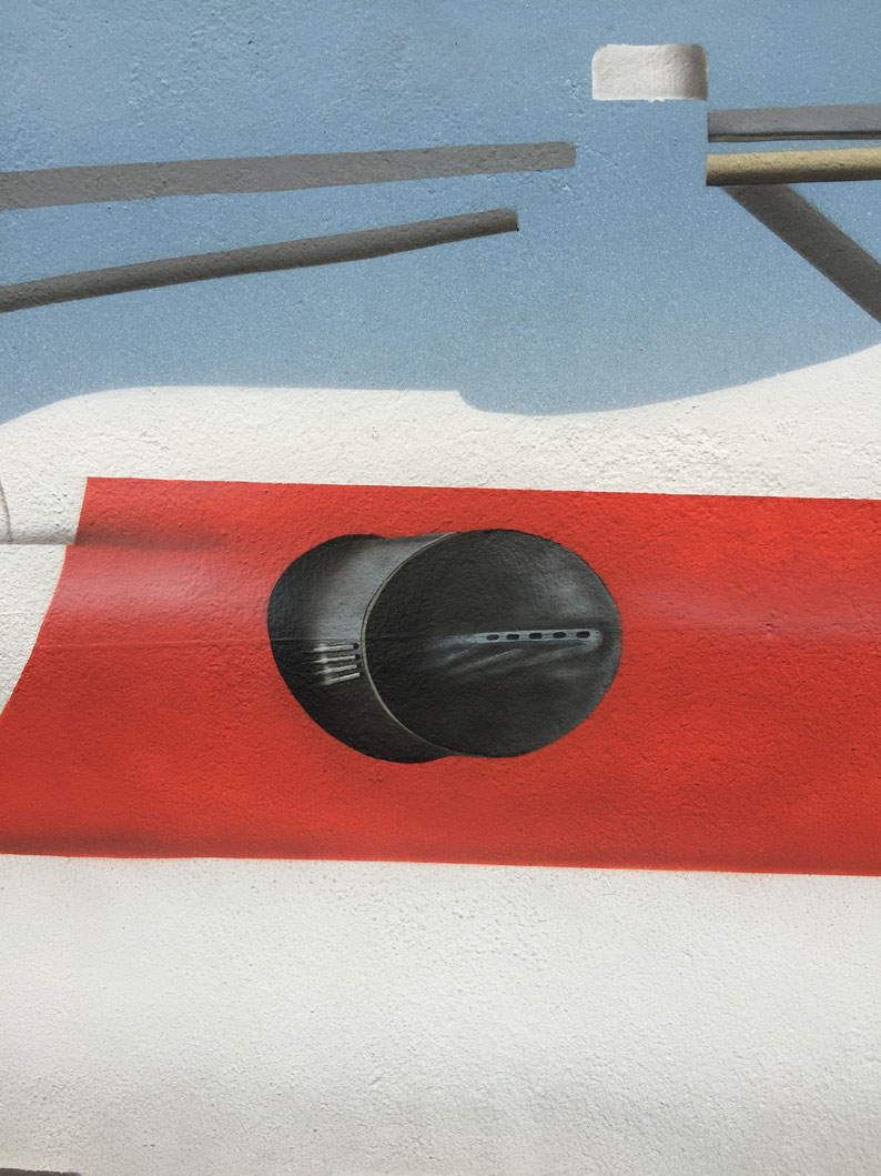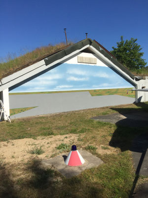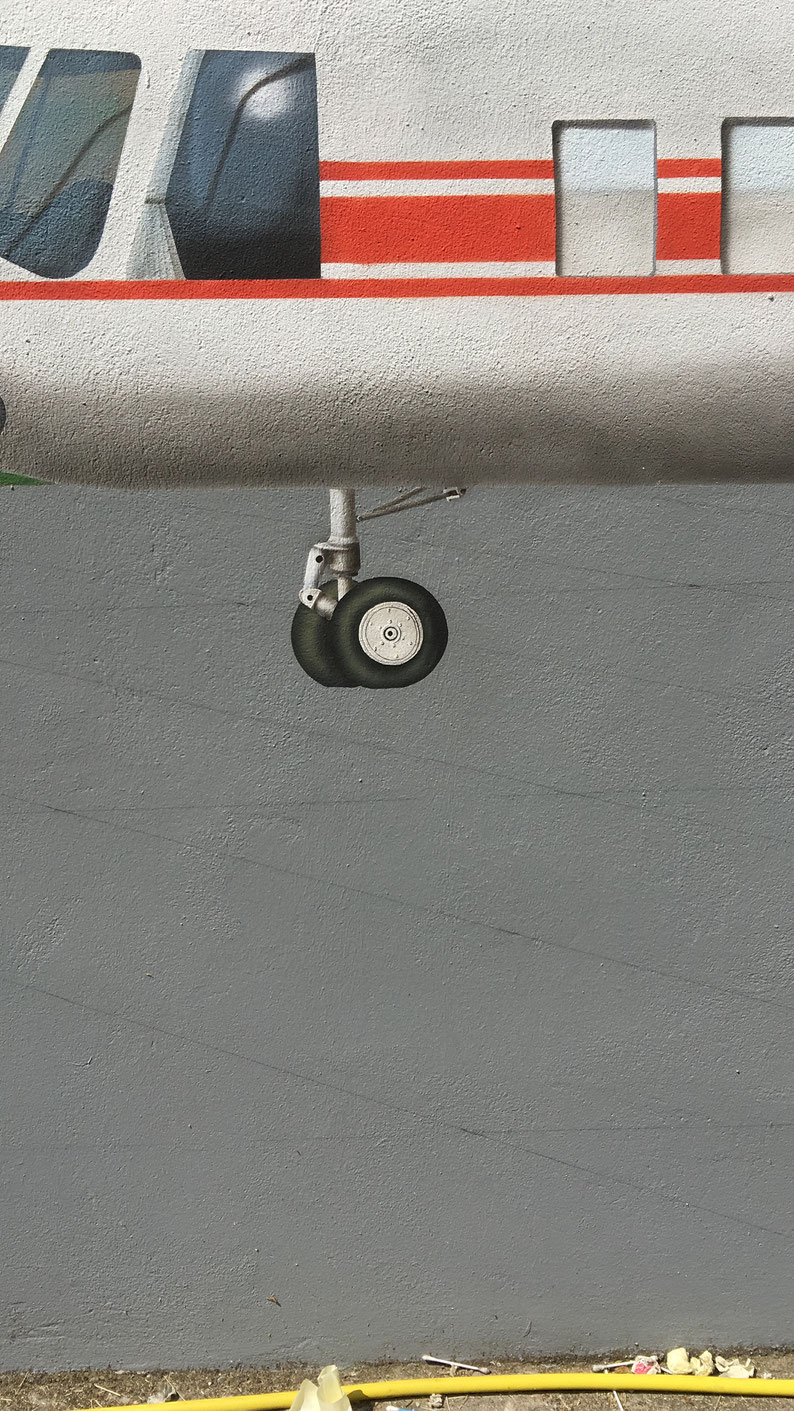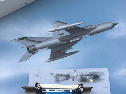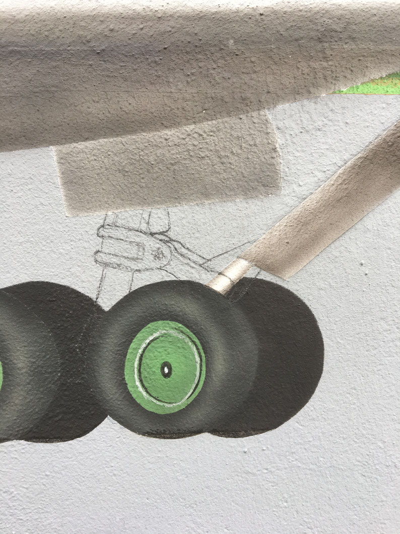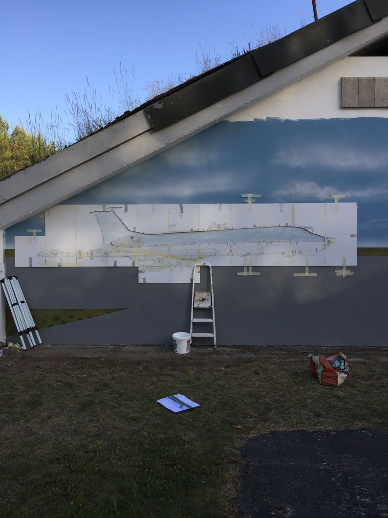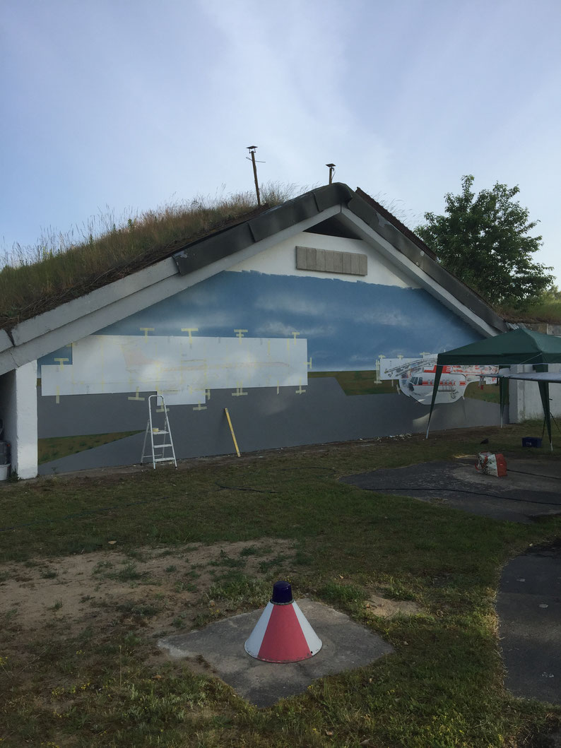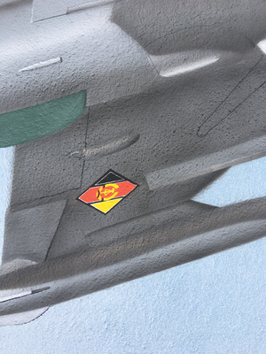 Auf dem Wandbild sind links eine TU 134 und rechts eine MI 8S mit der Lackierung des Transportfliegergeschwaders 44 (Regierungsflieger) zu sehen und im oberen Teil 2 MiG 21.